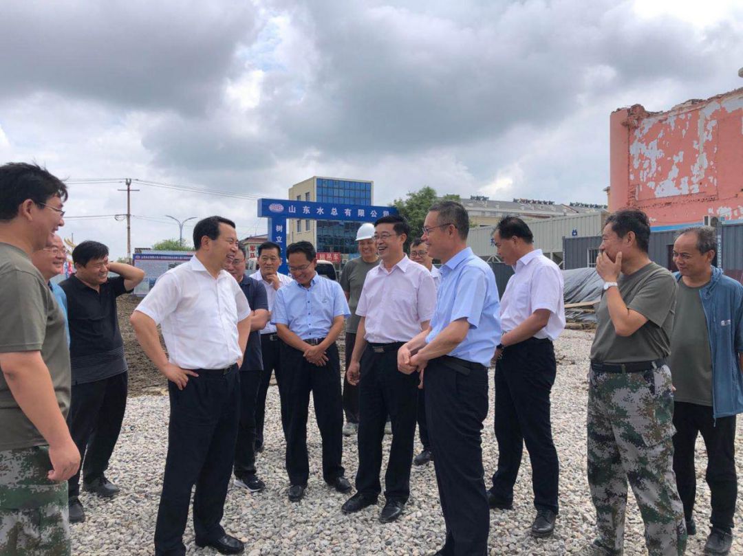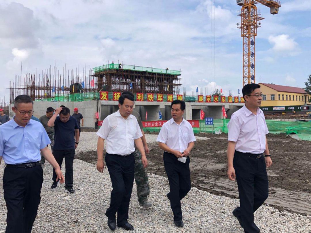 2020年7月13日,山东省水利厅厅长刘中会在寿光市委书记赵绪春的陪同下,到第二分公司负责实施的小清河防洪综合治理工程羊桥泵站视察工程建设及防洪度汛情况,公司董事长刁望利陪同参加。刘厅长对羊桥泵站水下主体工程完工表示祝贺,对奋战在施工一线的工作人员表示慰问。羊桥泵站是小清河全线开工时间最晚、施工难度最大的建筑物,山东水总能够克服诸多困难圆满完成工程建设任务,体现了国企担当。刘厅长赞扬了公司施工组织合理、工序衔接紧密高效,通过不懈努力向业主单位、向省水利厅交上了完美答卷。他要求在做好剩余工程施工的同时要做好防洪度汛工作,确保在建工程在汛期不出问题,备齐备足防汛物资、机械、人员,做好防大汛、抗大洪的准备。