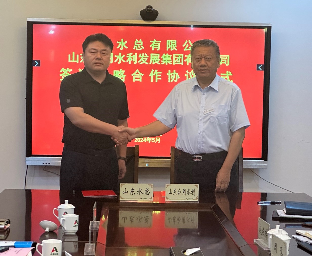 5月23日,公司与山东公用水利发展集团有限公司在七楼会议室举行了隆重的战略合作签约仪式。公司党委书记、董事长裴文晶,山东公用水利发展集团党委书记、董事长杨凤军出席签约仪式并讲话。
